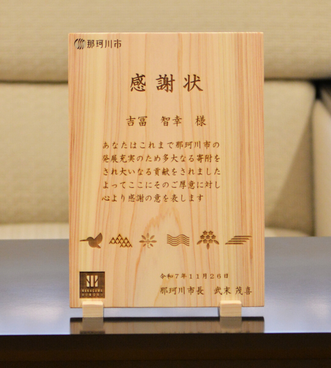 贈呈式では、地域材である那珂川産の檜(ひのき)を使用した感謝状をいただきました。温かみのある木の香りと手触りが伝わる感謝状に、私たちの想いを丁寧に受け止めてくださっていることを実感しました。